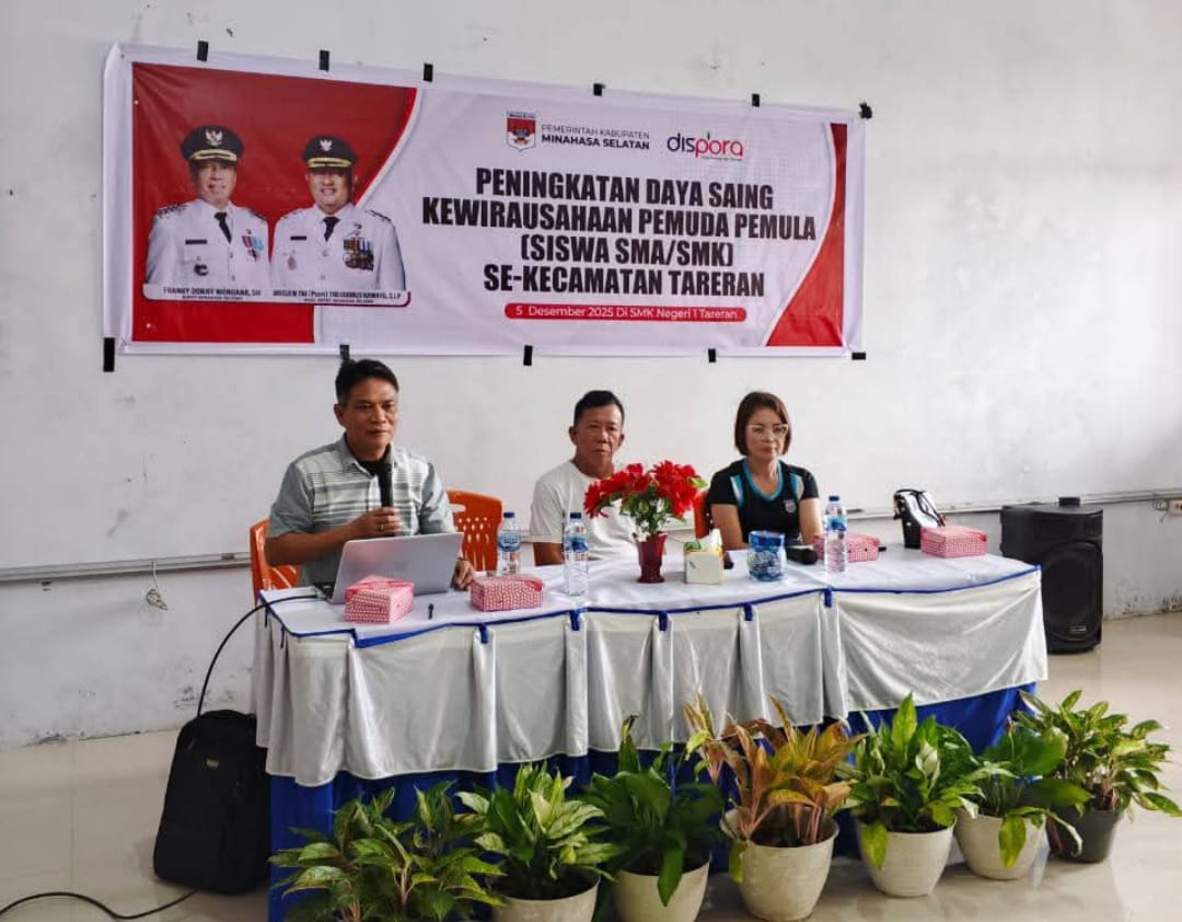 MINSEL, MSN — Dinas Pemuda dan Olahraga (Dispora) Kabupaten Minahasa Selatan menggelar kegiatan Peningkatan Daya Saing Kewirausahaan Pemuda Pemula SMA/SMK se-Kecamatan Tareran, yang dilaksanakan di SMK Negeri 1 Tareran, Jumat (05/12/2035).