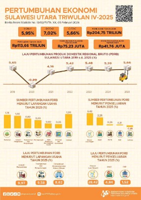 Pada Triwulan IV 2025, pertumbuhan ekonomi Sulawesi Utara tercatat sebesar 5,95 persen (year-on-year). Pertumbuhan tertinggi terjadi pada sektor Penyediaan Akomodasi dan Makan Minum dengan capaian 20,67 persen, sejalan dengan peningkatan aktivitas pariwisata dan usaha pendukungnya.