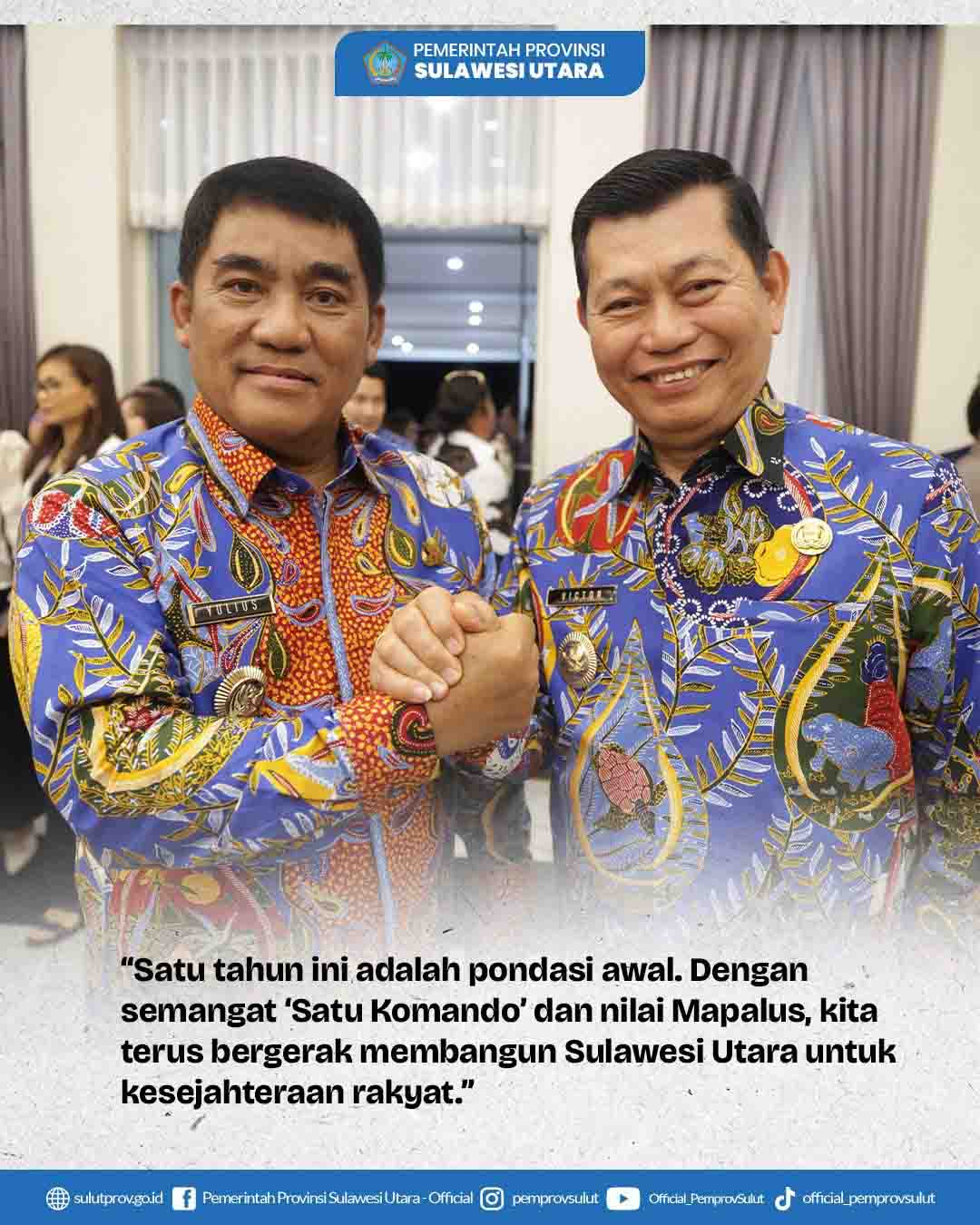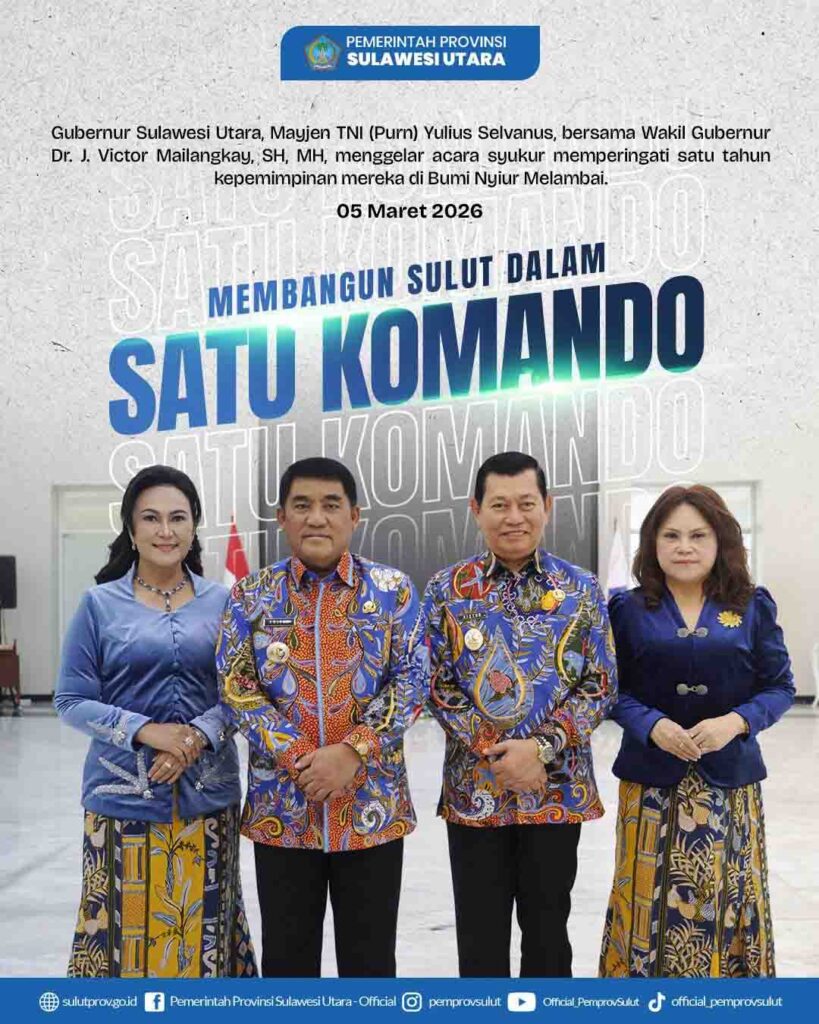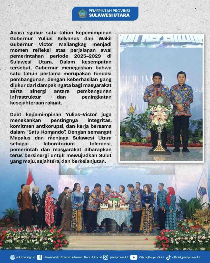 SULUT– Satu tahun kepemimpinan Gubernur Sulawesi Utara, Mayjen TNI (Purn) Yulius Selvanus, bersama Wakil Gubernur Dr. J. Victor Mailangkay, SH, MH, telah dilalui dengan berbagai capaian yang patut disyukuri. Duet kepemimpinan yang dikenal dengan sebutan YSK–Victory ini terus menunjukkan komitmen kuat dalam membangun Sulawesi Utara.