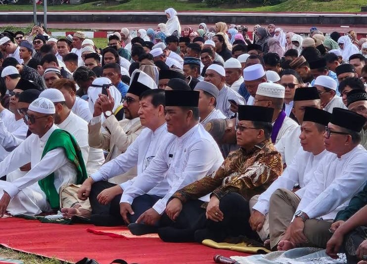 MANADO — Suasana khidmat menyelimuti Lapangan Sparta Tikala, Manado, saat ribuan umat Muslim melaksanakan Salat Idul Fitri 1 Syawal 1447 Hijriah, Sabtu (21/3/2026) pagi. Dalam momentum penuh makna tersebut, Gubernur Sulawesi Utara, Mayjen TNI (Purn) Yulius Selvanus, SE, hadir bersama jajaran Pemerintah Kota Manado dan tokoh agama.
