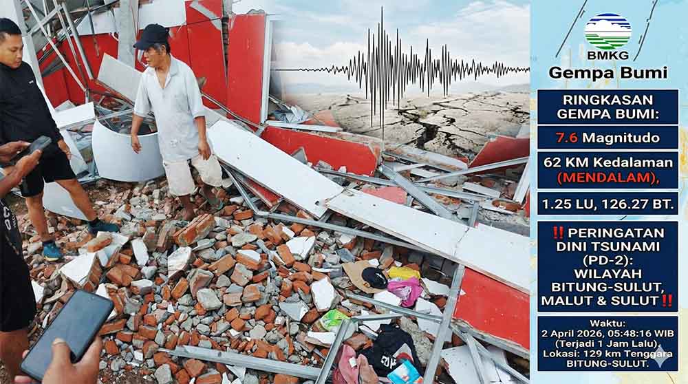 MANADO – Wilayah Provinsi Sulawesi Utara diguncang berkekuatan Magnitudo 7,6, Kamis pagi (2/4/2026). Gempa yang berpusat di laut dengan jarak 129 kilometer Tenggara Kota Bitung tersebut memicu peringatan dini tsunami dengan kenaikan permukaan air terdeteksi di Halmahera Barat sebesar 0,3 meter dan Bitung sebesar 0,2 meter.